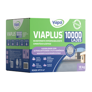 Viaplus 10.000 é um impermeabilizante bicomponente à base de copolímeros especiais formando uma membrana elástica com excelente aderência. Super flexível e 100% impermeável, é ideal para áreas sujeitas a trincas, fissuras e umidade em pressão positiva, resistente ao sol, maresia e intempéries, impermeabiliza e previne que microfissuras do substrato propaguem ou reflitam para o revestimento aplicado, garantindo maior durabilidade, desempenho estético e proteção da superfície.